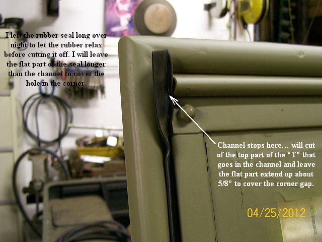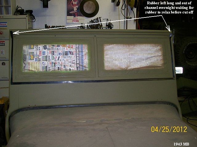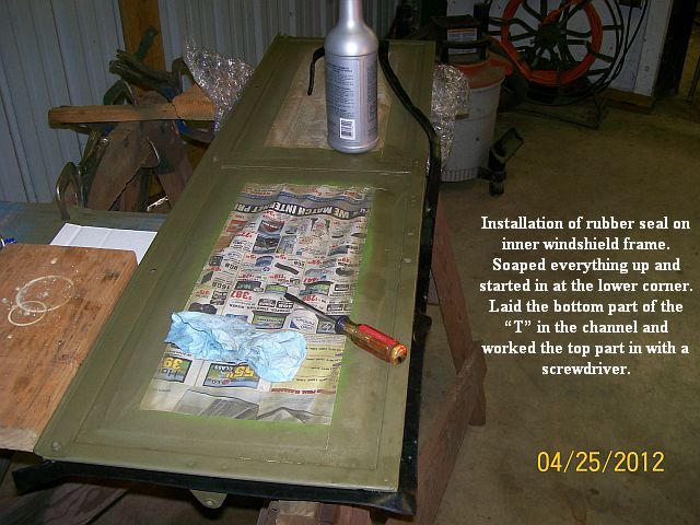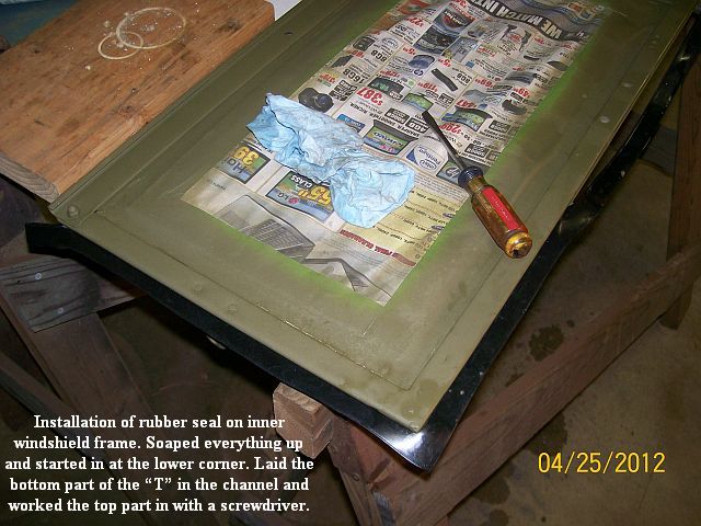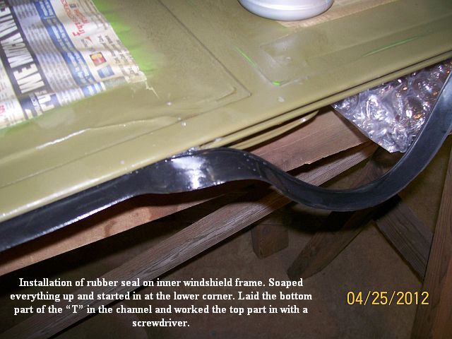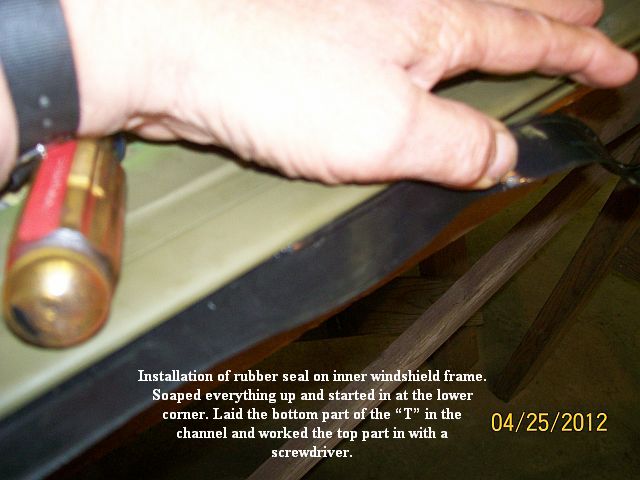 Started installing the rubber seal in it's channel. Soaped up the channel and rubber and tried to slide it into the channel at the cut-outs. Won't work... I found it easier to tip the lower part of the "T" into the channel and work the top part in with a screwdriver. Whole job took about an hour (lots of patience) and I didn't tear the rubber. I left the upper tails long overnight to let the rubber relax before cutting it off. I will leave about 5/8" of the flat part of the "T" on to cover the corner hole. Now that everything is fitted, I can put my final coats of paint on the windshield.