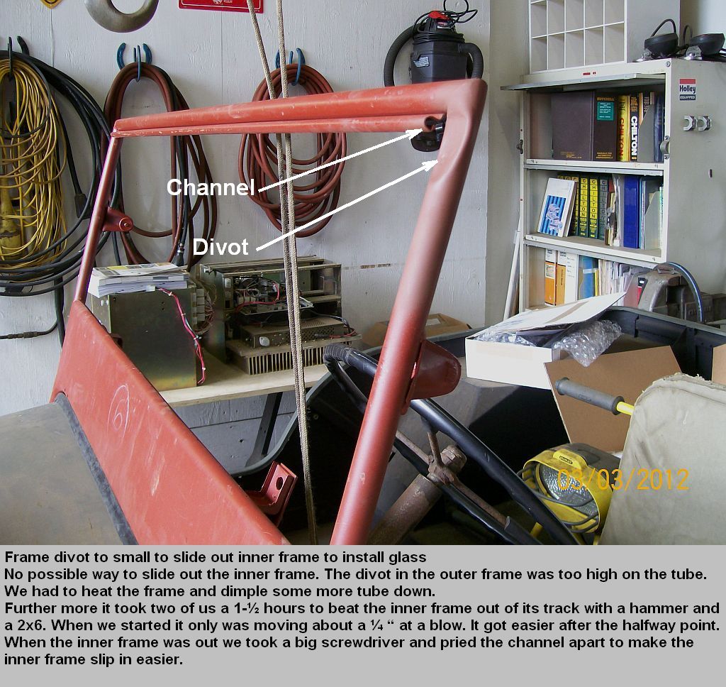 If you look close in this picture... you will notice that the inner frame sets too far into the outer frame. (bending the rubber seal out) This seems to stem from the top channel being attached too far towards the back of the outer frame. Comparing this after market inner frame to a stock one, I also find the stock frame is made thicker. (bringing the rubber seal forward) So far, I have not come up with a fix for this problem with the after market frame.