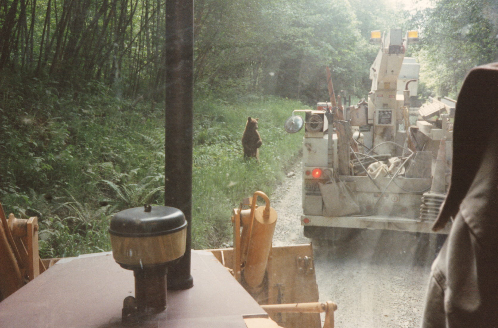 We had been doing storm repair on the cable feeding Lester & Stampede. Because of road conditions I had left my big truck and trailer at about the 12 mile and just followed the line truck with pole trailer and splicers bucket truck into the watershed with the backhoe. On our way out that evening the guys in the line truck hollered back to me on the CB radio to hurry up and catch up with them. They were stopped on the last hill before reaching the 12-mile parking spot. They had this cinnamon colored bear that was intrigued with their yellow pole trailer. They were sure he would really like my big yellow backhoe. Just like they figured, after I pulled up behind them… his interest in the pole trailer dropped like a rock. He wondered back to check out this new yellow machine.