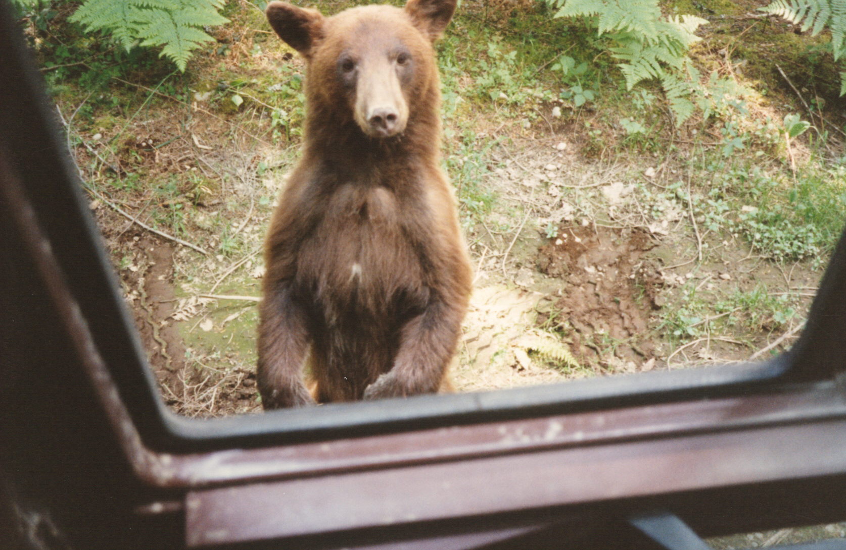He stood and just studied it for a bit. Kinda taking it all in. I had a small pop-top can of tuna left in my lunch bucket and I opened it and dumped it on the ground through the open window. He sucked that right down, then stood on his hind legs and looked into that magical machine for more. I spoke to him then telling him that was all I had. He then moved forward and put his paws on the bottom of the open window, just begging for more. Needless to say, I was snapping pictures the entire time and used up the last of my film. About that time the guys in the forward truck started up and headed on up the road. They hollered at me to hurry up and leave my little buddy because it was past quitting time. I left the bear cub and followed them the final quarter mile up to my trailer. I drove the backhoe onto the trailer and as I went to climb down the guys hollered again. Mikie… here comes your little buddy. As I looked over the steering wheel back down the way we had come… here he comes at an easy lope. I dropped down to the ground and started throwing chain to tie down the hoe. I hooked the off side first like usual… flipping the ramps up as I came around the back. The whole time keeping watch on my backside for the bear cub. As I started to flip the binder chains… here he comes around the back of the trailer. This whole time the guys had climbed up on the back of their truck and were keeping me apprised of his whereabouts. Just laughing and carrying on.