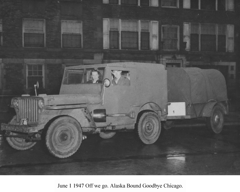Gib & Eileen Reid started north to Alaska from Chicago, Illinois June 1, 1947. They drove a military surplus jeep with a 6 canvas covered trailer hitched behind with everything they owned in it and $300.00 in their pockets. From what I can uncover, they stopped the first night in Minneapolis, Minnesota and most likely used Route 94. All pictures can be clicked on to be seen fullsize.The Start