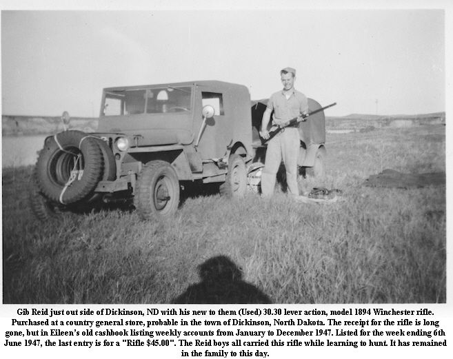 We have a picture of Gib just out side of Dickinson, ND with his new to them (Used) 30.30 lever action, model 1894 Winchester rifle. Purchased at a country general store, probable in the town of Dickinson, North Dakota. The receipt for the rifle is long gone, but in Eileens old cash book listing weekly accounts from January to December 1947. Listed for the week ending 6th June 1947, the last entry is for a "Rifle $45.00".Gib with new 30-30
