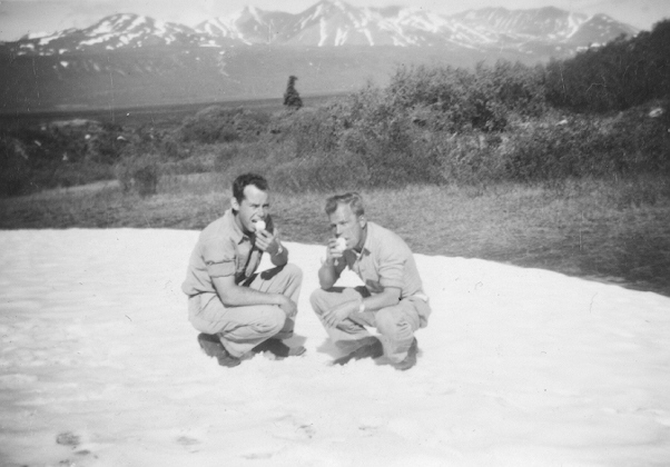 After a few days they went with Billy in his old truck, back down the Alcan to Haines Junction and then on down to Haines. Billy needed some supplies and Gib & Eileen went along for the ride. We have pictures of Gib & Billy at Chilkat Pass with snow on the ground on the 4th of July.