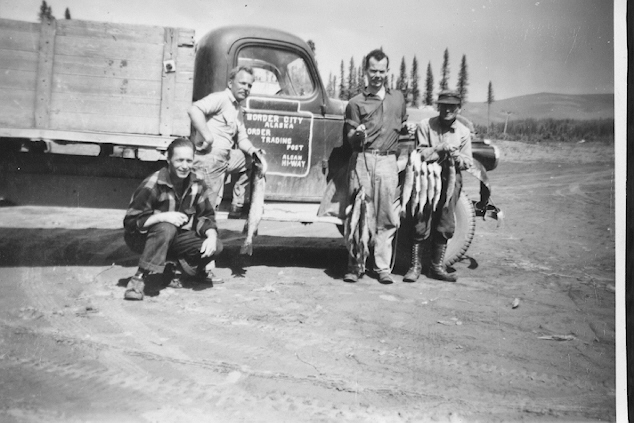 They stayed the night in Haines and returned to Border City Trading Post the next evening. Gib and Eileen also made other local fishing excursions with Billy. One trip Mom remembers is Billy taking the local Indians in his old truck to pick up their government checks. Then they willingly spent them at the Trading Post upon their return. One thing Mom remembers being a hot item was small bottles of Vanilla Extract which contained a small amount of alcohol. Indians could not buy spirits in those days.