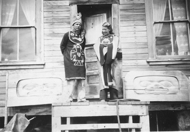 We have a picture of Eileen & Billy dressed in Indian Ceremonial Robes at the entrance to the Frog House in Haines.