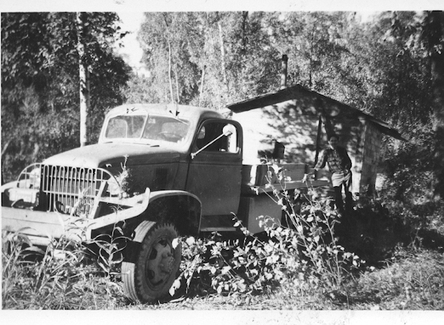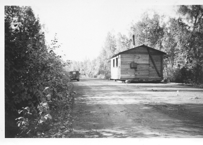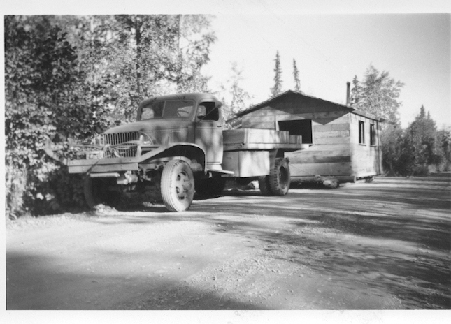 The date was set, 15 of Sep. 1947, and Johnny Stockhousen drove up in his Army Surplus 1 1/2 ton Chevy. 4 x 4 to do the job. Their building was constructed from dump lumber, picked up at the Army Base burn dump. The combination was called a "Skid-Shack or Wanagan",(Want-to-go-again]. The small building was 10 feet wide and 16 feet long, and constructed, and attached to 2 large spruce logs, which were braced and bolted at each end, so they and the building were towable. The building was constructed on Bobby and Sie Meadias home site, so John Stockhousen hooked up for the half mile tow down the road. He was able to tow the skidshack up off the road to the location the Reids designated, 30 feet west of the old cabin.They were able to turn it so the end was facing northwest.