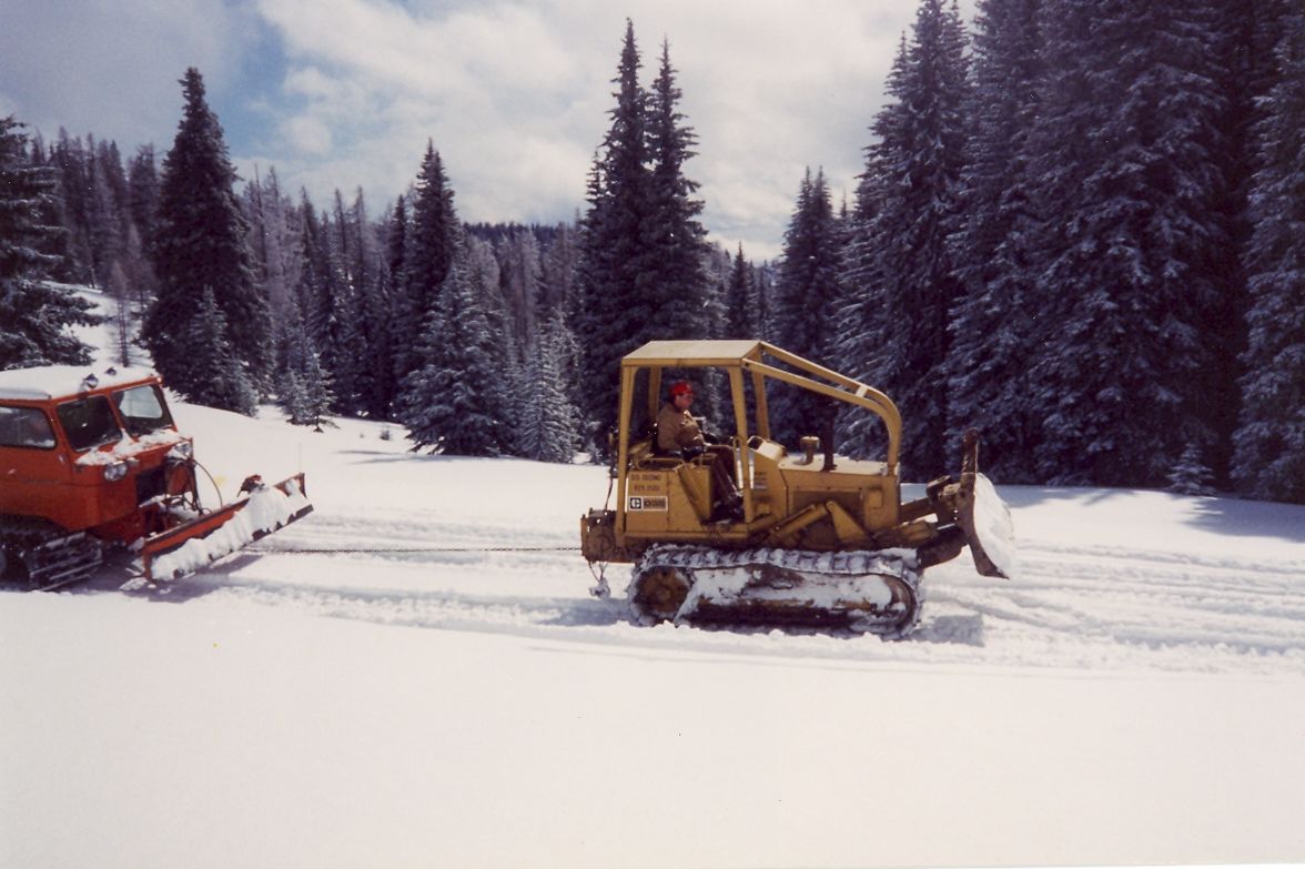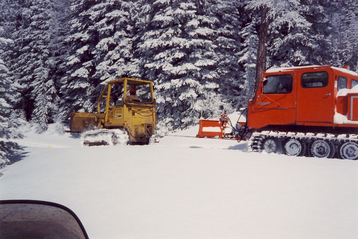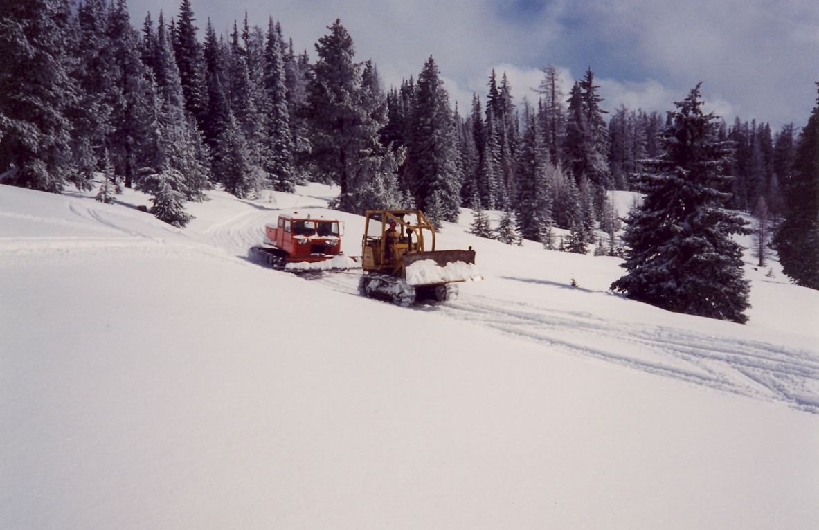 Dick Burrows AA7PR volunteered to take the crew up in his "new to him" Snowcat. Because it was untried, Mike N7NEW decided to ride his Snowmobiles along for backup. Kirk (Mike's Son rode the second sled) Everything went fine on the way up. The radio work was completed and we started back down. Kirk & Mike were riding ahead and sweeping up through the meadows playing. We noticed we had not seen the Snowcat for awhile so we rode back up the trail looking for the crew. We found them sitting dead in the water with a big puddle of oil behind where Dick shut the Cat down. After scrutinizing the situation we found that the front axel cross member had broke loose and slammed back into the engines oil pan. It broke some other stuff in the process. Well, the Cat was done so Kirk & Mike started ferrying crew members out to the trucks on the two Snowmobiles. Monday we hired a D3 dozer to travel into the Snowcat and pull it out to the trailer. (about 7 miles in)