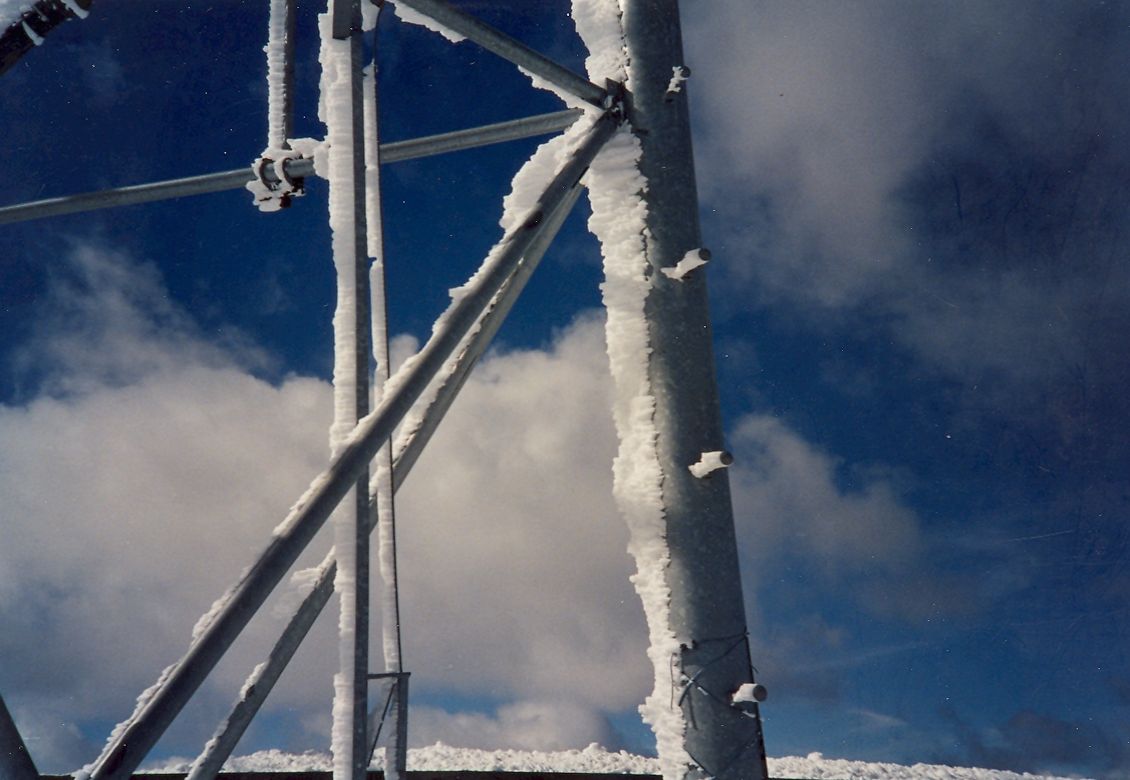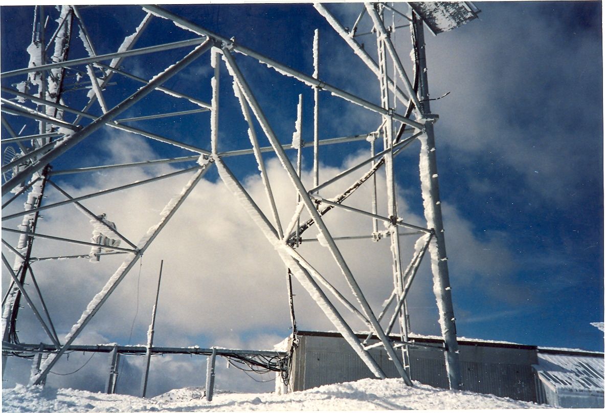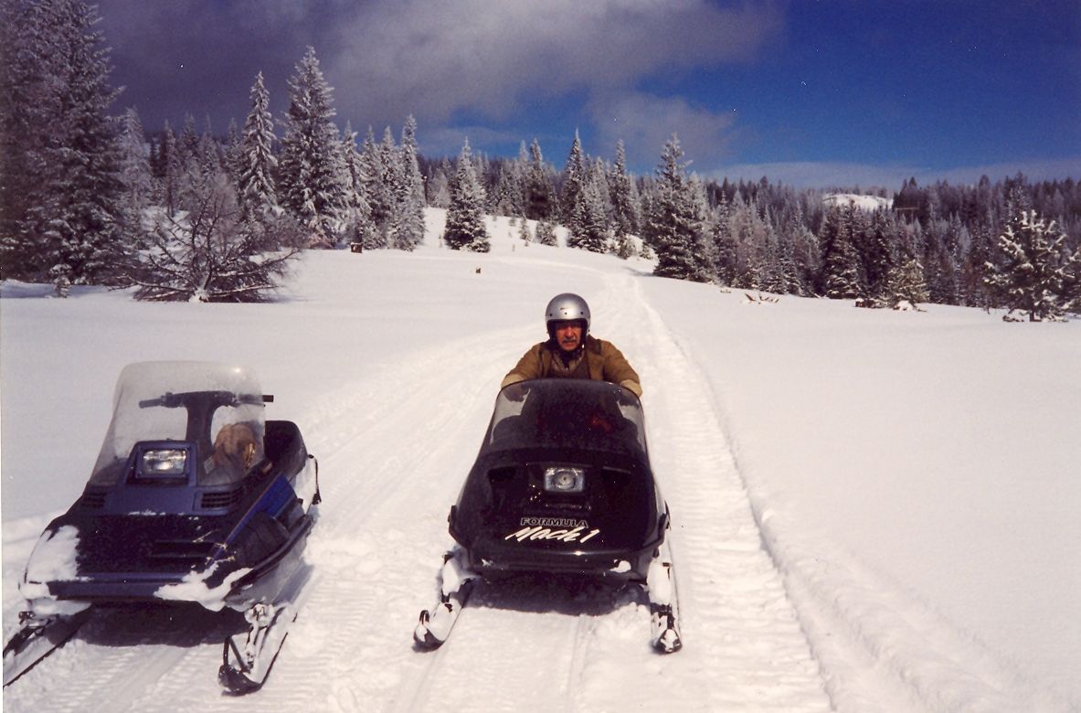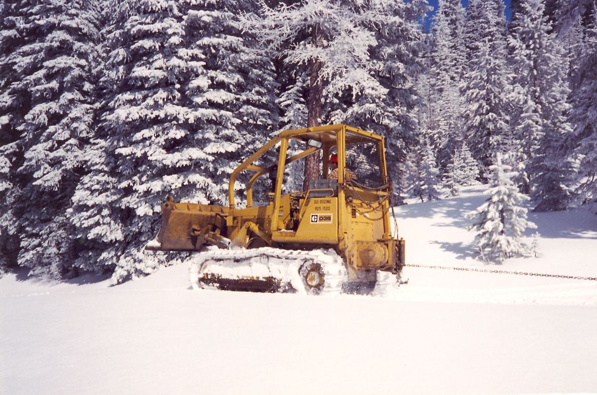 Dick Burrows AA7PR volunteered to take the crew up in his "new to him" Snowcat. Because it was untried, Mike N7NEW decided to ride his Snowmobiles along for backup. Kirk (Mike's Son rode the second sled) Everything went fine on the way up. The radio work was completed and we started back down. Kirk & Mike were riding ahead and sweeping up through the meadows playing. We noticed we had not seen the Snowcat for awhile so we rode back up the trail looking for the crew. We found them sitting dead in the water with a big puddle of oil behind where Dick shut the Cat down. After scrutinizing the situation we found that the front axel cross member had broke loose and slammed back into the engines oil pan. It broke some other stuff in the process. Well, the Cat was done so Kirk & Mike started ferrying crew members out to the trucks on the two Snowmobiles. Monday we hired a D3 dozer to travel into the Snowcat and pull it out to the trailer. (about 7 miles in)