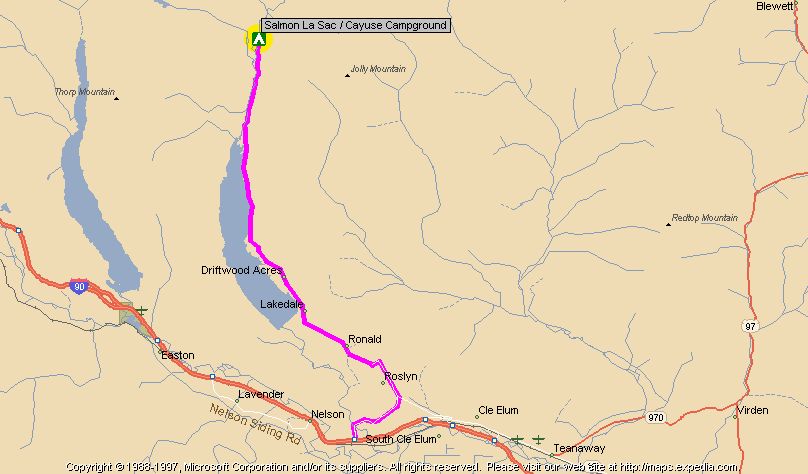 Driving Directions: From I-90, Take either the Cle Elum or Roslyn Exit and go north on SR 903 through Roslyn & Ronald. Continue north along Cle Elum Lake to the Salmon La Sac Campground.