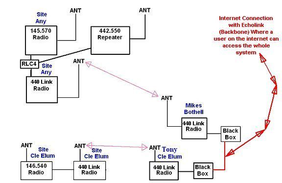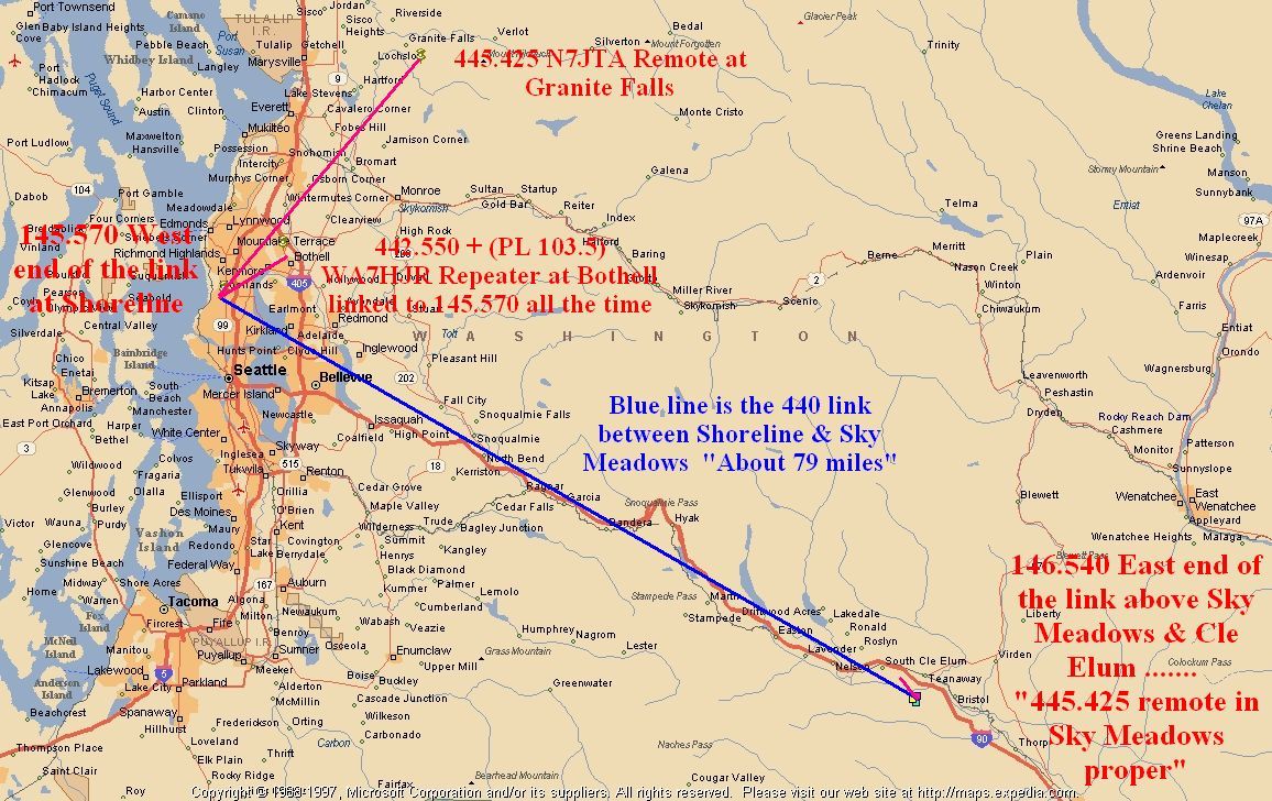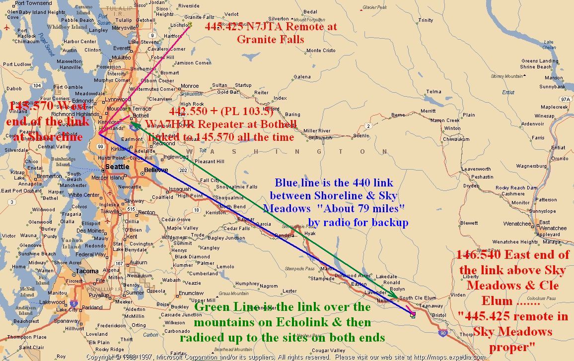 This is a cross band link system connecting Eastern Washington to Western Washington. The path for this system was from the Shoreline area in north Seattle to the Skymeadows area near Cle Elum on the 70 CM band. It can be accessed from 145.570 on the west side and 146.540 on the east side. The path through the Cascades was on the 440 band and roughly follows the I90 corridor. This system is PL protected and 91.5 is the tone used.
